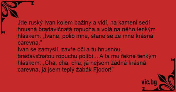 Jde ruský Ivan kolem bažiny a vidí, na kameni sedí hnusná bradavičnatá ropucha a volá na něho tenkým hláskem: „Ivane, polib mne, stane se ze mne krásná carevna.”