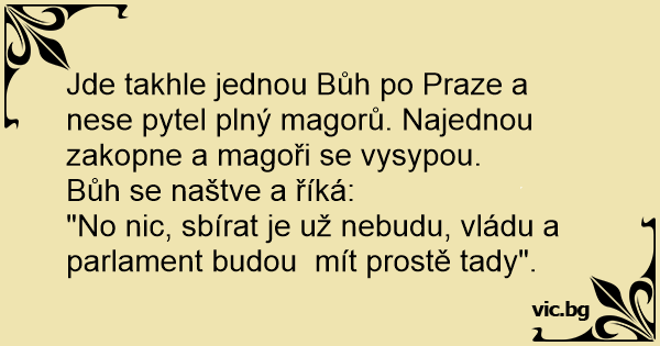 Jde takhle jednou Bůh po Praze a nese pytel plný magorů. Najednou zakopne a magoři se vysypou.