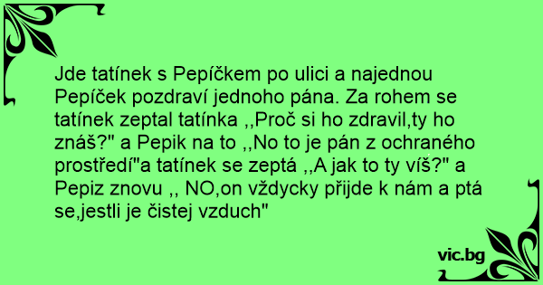 Jde tatínek s Pepíčkem po ulici a najednou Pepíček pozdraví jednoho pána. Za rohem se tatínek zeptal tatínka ,,Proč si hо zdravil,ty hо znáš?" a Pepik na to ,,No to je pán z ochraného prostředí"a tatínek se zeptá ,,A jak to ty víš?" a Pepiz znovu ,, NO,on vždycky přijde k nám a ptá se,jestli je čistej vzduch"