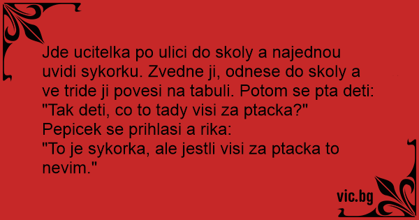 Jde ucitelka po ulici do skoly a najednou uvidi sykorku. Zvedne ji, odnese do skoly a ve tride ji povesi na tabuli. Potom se pta deti: