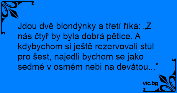 Jdou dvě blondýnky a třetí říká: „Z nás čtyř by byla dobrá pětice. A kdybychom si ještě rezervovali stůl pro šest, najedli bychom se jako sedmé v osmém nebi na devátou...”