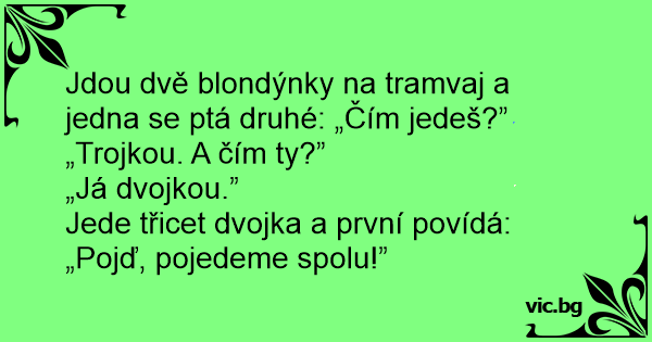 Jdou dvě blondýnky na tramvaj a jedna se ptá druhé: „Čím jedeš?”