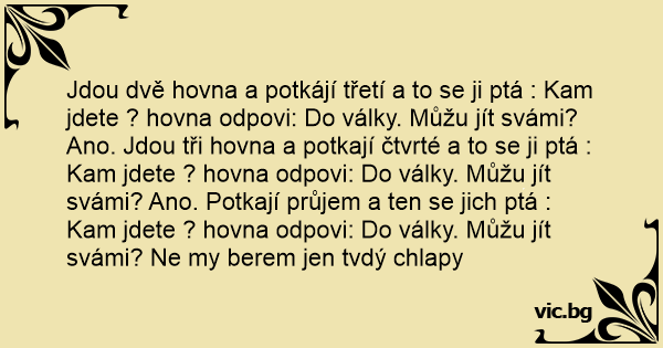 Jdou dvě hovna a potkájí třetí a to se ji ptá : Kam jdete ? hovna odpovi: Do války. Můžu jít svámi? Ano. Jdou tři hovna a potkají čtvrté a to se ji ptá : Kam jdete ? hovna odpovi: Do války. Můžu jít svámi? Ano. Potkají průjem a ten se jich ptá : Kam jdete ? hovna odpovi: Do války. Můžu jít svámi? Ne my berem jen tvdý chlapy
