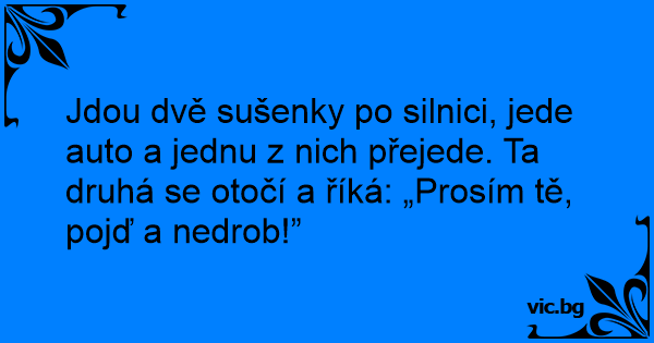 Jdou dvě sušenky po silnici, jede auto a jednu z nich přejede. Ta druhá se otočí a říká: „Prosím tě, pojď a nedrob!”
