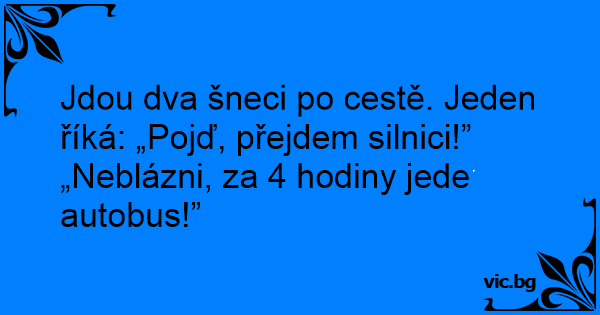Jdou dva šneci po cestě. Jeden říká: „Pojď, přejdem silnici!”