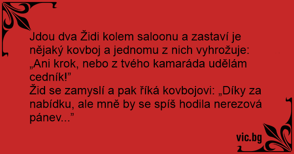 Žid se zamyslí a pak říká kovbojovi: „Díky za nabídku, ale mně by se spíš hodila nerezová pánev...”
