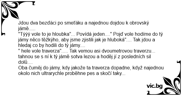 "Týýý vole to je hloubka"... Povídá jeden...." Pojď vole hodíme do tý jámy něco těžkýho, aby jsme zjistili jak je hluboká".... Tak jdou a hledaj co by hodili do tý jámy....