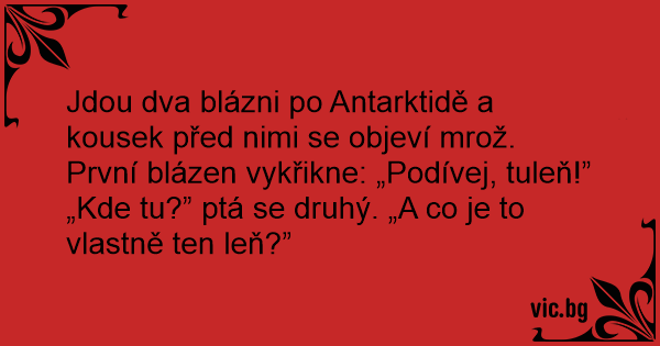Jdou dva blázni po Antarktidě a kousek před nimi se objeví mrož. První blázen vykřikne: „Podívej, tuleň!”