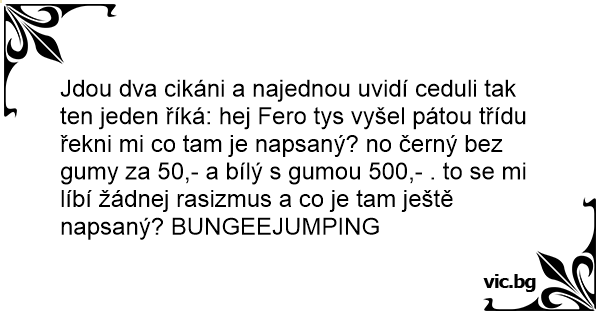 Jdou dva cikáni a najednou uvidí ceduli tak ten jeden říká: hej Fero tys vyšel pátou třídu řekni mi co tam je napsaný? no černý bez gumy za 50,- a bílý s gumou 500,- . to se mi líbí žádnej rasizmus a co je tam ještě napsaný? BUNGEEJUMPING