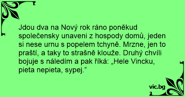 Jdou dva na Nový rok ráno poněkud společensky unaveni z hospody domů, jeden si nese urnu s popelem tchyně. Mrzne, jen to praští, a taky to strašně klouže. Druhý chvíli bojuje s náledím a pak říká: „Hele Vincku, pieta nepieta, sypej.”