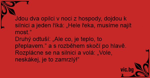 Jdou dva opilci v noci z hospody, dojdou k silnici a jeden říká: „Hele řeka, musíme najít most.”