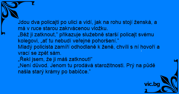 „Běž ji zatknout,” přikazuje služebně starší policajt svému kolegovi, „ať tu nebudí veřejné pohoršení.”