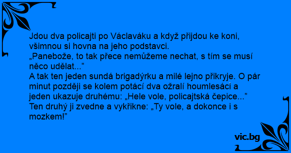 Jdou dva policajti po Václaváku a když přijdou ke koni, všimnou si hovna na jeho podstavci.