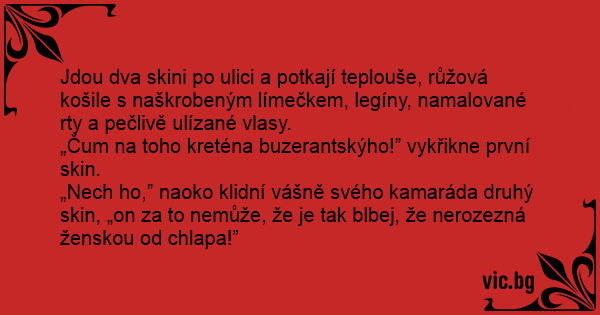 „Nech hо,” naoko klidní vášně svého kamaráda druhý skin, „on za to nemůže, že je tak blbej, že nerozezná ženskou od chlapa!”