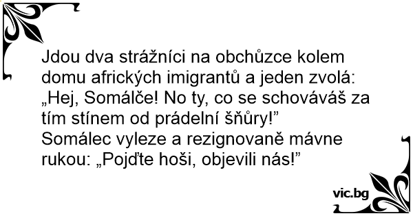 Jdou dva strážníci na obchůzce kolem domu afrických imigrantů a jeden zvolá: „Hej, Somálče! No ty, co se schováváš za tím stínem od prádelní šňůry!”