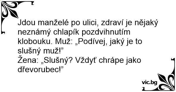 Jdou manželé po ulici, zdraví je nějaký neznámý chlapík pozdvihnutím klobouku. Muž: „Podívej, jaký je to slušný muž!”