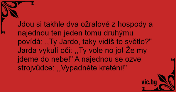 Jdou si takhle dva ožralové z hospody a najednou ten jeden tomu druhýmu povídá: ,,Ty Jardo, taky vidíš to světlo?" Jarda vykulí oči: ,,Ty vole no jo! Že my jdeme do nebe!" A najednou se ozve strojvůdce: ,,Vypadněte kreténi!"