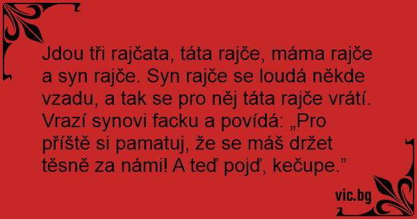 Jdou tři rajčata, táta rajče, máma rajče a syn rajče. Syn rajče se loudá někde vzadu, a tak se pro něj táta rajče vrátí. Vrazí synovi facku a povídá: „Pro příště si pamatuj, že se máš držet těsně za námi! A teď pojď, kečupe.”