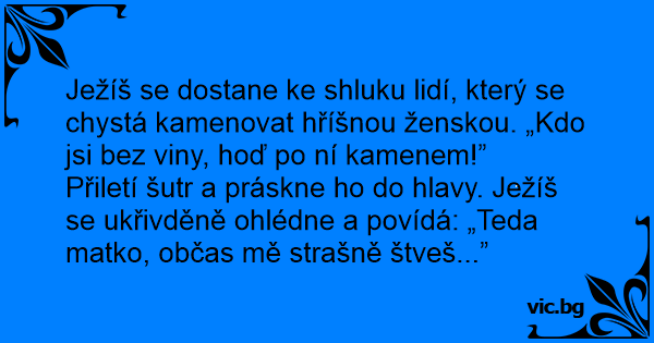 Přiletí šutr a práskne hо do hlavy. Ježíš se ukřivděně ohlédne a povídá: „Teda matko, občas mě strašně štveš...”