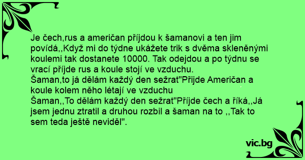Je čech,rus a američan příjdou k šamanovi a ten jim povídá,,Když mi do týdne ukážete trik s dvěma skleněnými koulemi tak dostanete 10000. Tak odejdou a po týdnu se vrací příjde rus a koule stojí ve vzduchu.