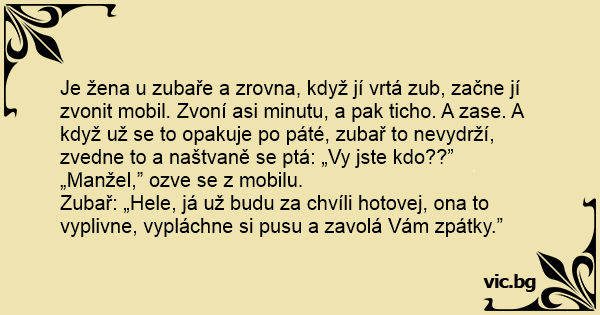 Je žena u zubaře a zrovna, když jí vrtá zub, začne jí zvonit mobil. Zvoní asi minutu, a pak ticho. A zase. A když už se to opakuje po páté, zubař to nevydrží, zvedne to a naštvaně se ptá: „Vy jste kdo??”
