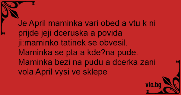 Je April maminka vari obed a vtu k ni prijde jeji dceruska a povida ji:maminko tatinek se obvesil. Maminka se pta a kde?na pude. Maminka bezi na pudu a dcerka zani vola April vysi ve sklepe