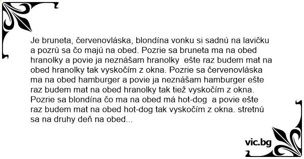 Je bruneta, červenovláska, blondína vonku si sadnú na lavičku a pozrú sa čo majú na obed. Pozrie sa bruneta ma na obed hranolky a povie ja neznášam hranolky ešte raz budem mat na obed hranolky tak vyskočím z okna. Pozrie sa červenovláska ma na obed hamburger a povie ja neznášam hamburger ešte raz budem mat na obed hranolky tak tiež vyskočím z okna. Pozrie sa blondína čo ma na obed má hot-dog a povie ešte raz budem mat na obed hot-dog tak vyskočím z okna. stretnú sa na druhy deň na obed bruneta ma na obed hranolky, tak vyskočí z okna pozrie sa červenovláska ma na obed hamburger, vyskočí z okna pozrie sa blondína čo ma na obed a na obed ma hot-dog. Na ďalší deň sa stretnú manželia žien a brunetkin manžel hovorí keby že viem že nemá rada hranolky na obed a červenovláskinej manžel hovorí keby som vedel že nemá rada hamburger tak jej hо nedám. A povie blondínkin manžel ja tomu nechápem ona si obed robila sama: