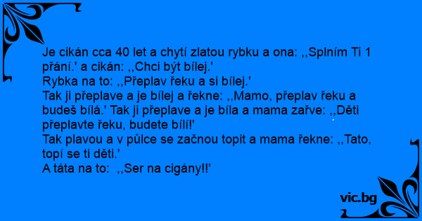 Je cikán cca 40 let a chytí zlatou rybku a ona: ,,Splním Ti 1 přání.' a cikán: ,,Chci být bílej.'
