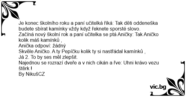 Je konec školního roku a paní učitelká říká: Tak děti oddeneška budete sbírat kamínky vždy když řeknete sporsté slovo.