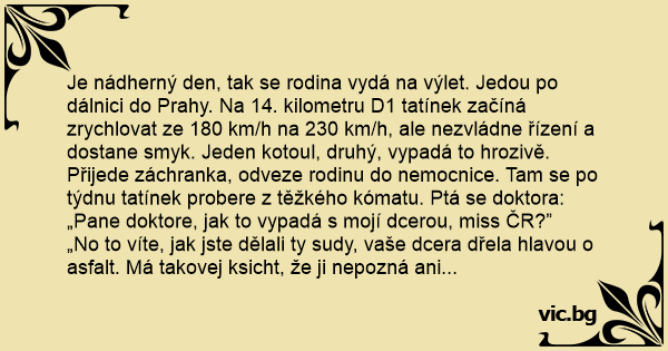 Je nádherný den, tak se rodina vydá na výlet. Jedou po dálnici do Prahy. Na 14. kilometru D1 tatínek začíná zrychlovat ze 180 km/h na 230 km/h, ale nezvládne řízení a dostane smyk. Jeden kotoul, druhý, vypadá to hrozivě. Přijede záchranka, odveze rodinu do nemocnice. Tam se po týdnu tatínek probere z těžkého kómatu. Ptá se doktora: „Pane doktore, jak to vypadá s mojí dcerou, miss ČR?”