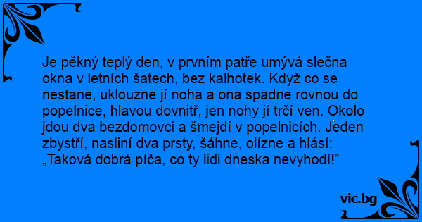 Je pěkný teplý den, v prvním patře umývá slečna okna v letních šatech, bez kalhotek. Když co se nestane, uklouzne jí noha a ona spadne rovnou do popelnice, hlavou dovnitř, jen nohy jí trčí ven. Okolo jdou dva bezdomovci a šmejdí v popelnicích. Jeden zbystří, nasliní dva prsty, šáhne, olízne a hlásí: „Taková dobrá píča, co ty lidi dneska nevyhodí!”