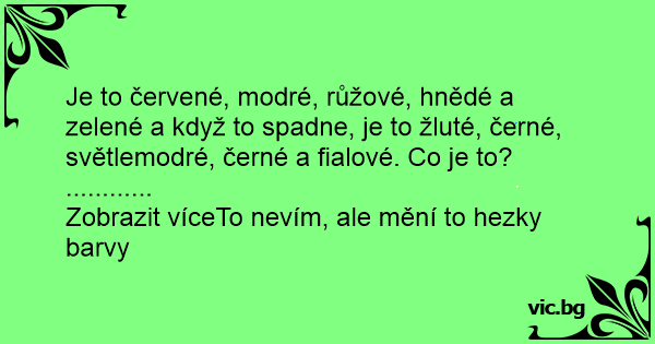 Je to červené, modré, růžové, hnědé a zelené a když to spadne, je to žluté, černé, světlemodré, černé a fialové. Co je to?