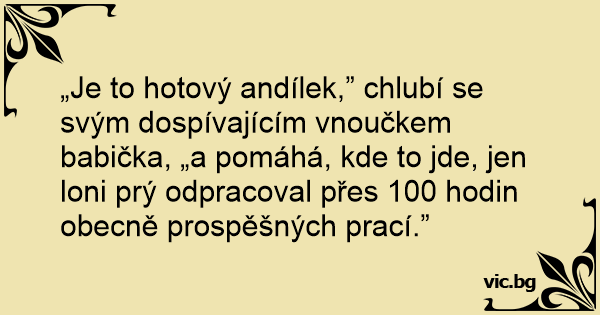 „Je to hotový andílek,” chlubí se svým dospívajícím vnoučkem babička, „a pomáhá, kde to jde, jen loni prý odpracoval přes 100 hodin obecně prospěšných prací.”