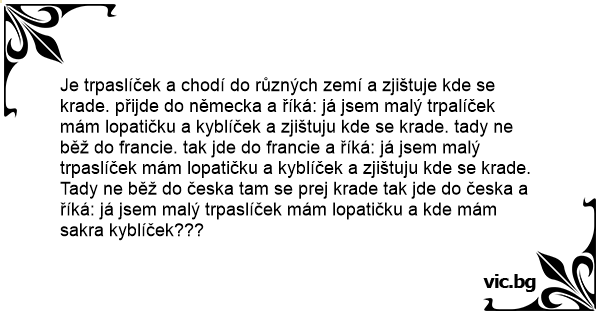 Je trpaslíček a chodí do různých zemí a zjištuje kde se krade. přijde do německa a říká: já jsem malý trpalíček mám lopatičku a kyblíček a zjištuju kde se krade. tady ne běž do francie. tak jde do francie a říká: já jsem malý trpaslíček mám lopatičku a kyblíček a zjištuju kde se krade. Tady ne běž do česka tam se prej krade tak jde do česka a říká: já jsem malý trpaslíček mám lopatičku a kde mám sakra kyblíček???