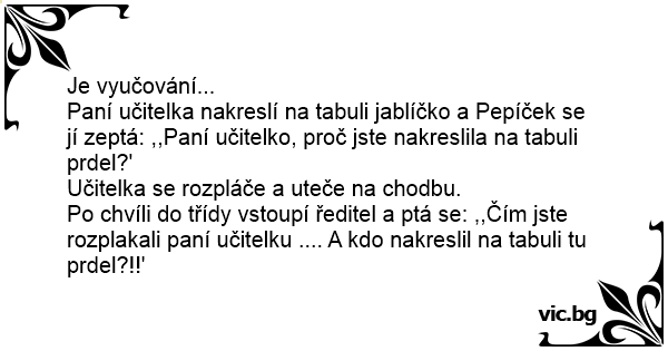 Po chvíli do třídy vstoupí ředitel a ptá se: ,,Čím jste rozplakali paní učitelku .... A kdo nakreslil na tabuli tu prdel?!!'