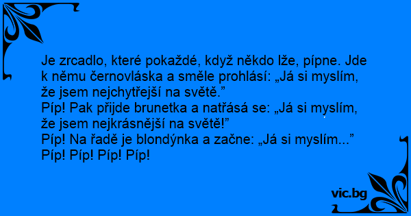 Je zrcadlo, které pokaždé, když někdo lže, pípne. Jde k němu černovláska a směle prohlásí: „Já si myslím, že jsem nejchytřejší na světě.”