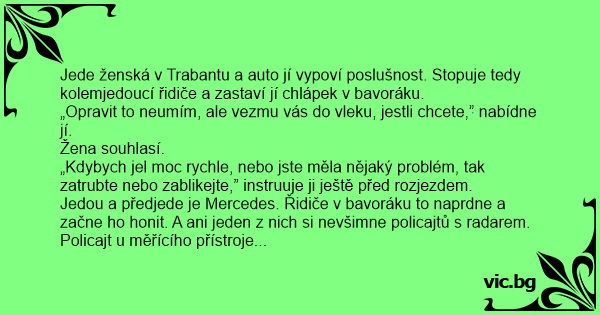 Jede ženská v Trabantu a auto jí vypoví poslušnost. Stopuje tedy kolemjedoucí řidiče a zastaví jí chlápek v bavoráku.