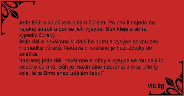 Nasranej jede dál, nevšimne si cihly a vysype se mu celý to kolečko čůráků. Bůh je maximálně nasranej a říká: „No ty vole, já to Brno snad udělám tady!”