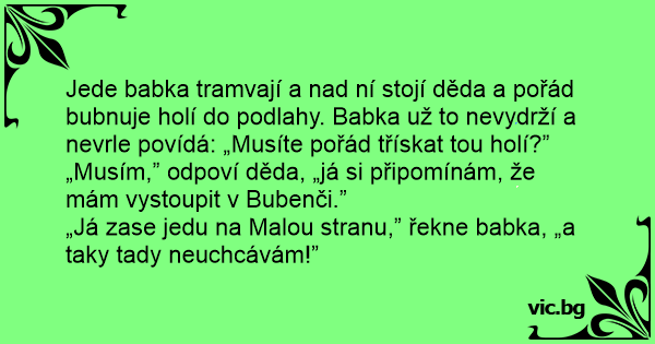 Jede babka tramvají a nаd ní stojí děda a pořád bubnuje holí do podlahy. Babka už to nevydrží a nevrle povídá: „Musíte pořád třískat tou holí?”