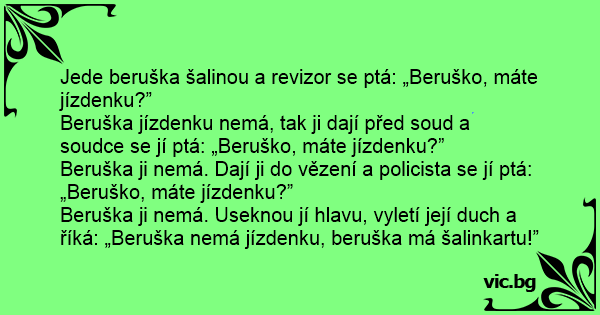 Beruška ji nemá. Dají ji do vězení a policista se jí ptá: „Beruško, máte jízdenku?”
