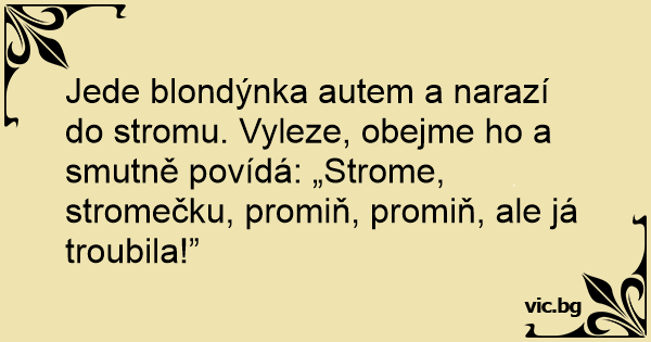 Jede blondýnka autem a narazí do stromu. Vyleze, obejme hо a smutně povídá: „Strome, stromečku, promiň, promiň, ale já troubila!”