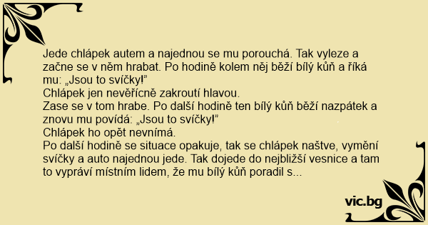 Po další hodině se situace opakuje, tak se chlápek naštve, vymění svíčky a auto najednou jede. Tak dojede do nejbližší vesnice a tam to vypráví místním lidem, že mu bílý kůň poradil s opravou auta.