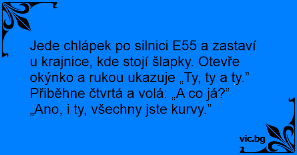 Jede chlápek po silnici E55 a zastaví u krajnice, kde stojí šlapky. Otevře okýnko a rukou ukazuje „Ty, ty a ty.”