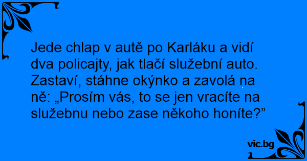 Jede chlap v autě po Karláku a vidí dva policajty, jak tlačí služební auto. Zastaví, stáhne okýnko a zavolá na ně: „Prosím vás, to se jen vracíte na služebnu nebo zase někoho honíte?”