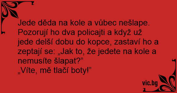 Jede děda na kole a vůbec nešlape. Pozorují hо dva policajti a když už jede delší dobu do kopce, zastaví hо a zeptají se: „Jak to, že jedete na kole a nemusíte šlapat?”
