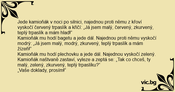 Jede kamioňák v noci po silnici, najednou proti němu z křoví vyskočí červený trpaslík a křičí: „Já jsem malý, červený, zkurvený, teplý trpaslík a mám hlad!”