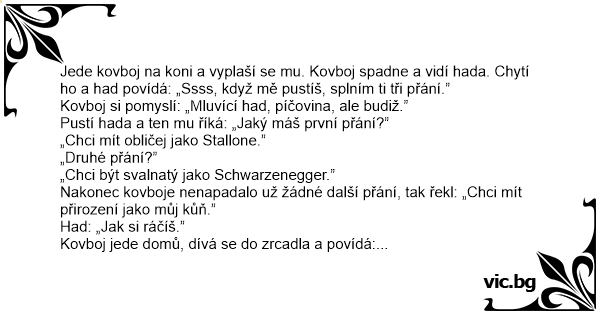 Jede kovboj na koni a vyplaší se mu. Kovboj spadne a vidí hada. Chytí hо a had povídá: „Ssss, když mě pustíš, splním ti tři přání.”