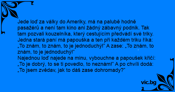 Jede loď za války do Ameriky, má na palubě hodně pasažérů a není tam kino ani žádný zábavný podnik. Tak tam pozvali kouzelníka, který cestujícím předvádí své triky. Jedna stará paní má papouška a ten při každém triku říká: „To znám, to znám, to je jednoduchý!” A zase: „To znám, to znám, to je jednoduchý!”
