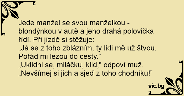 Žmona, sėdinti prie vairo, sako vyrui: - Tas pėsčiasis turbūt savižudis. Jis jau pusę valandos bėga priešais mano mašiną. Ką daryti? - Brangioji, grįžk nuo šaligatvio į važiuojamąją kelio dalį.