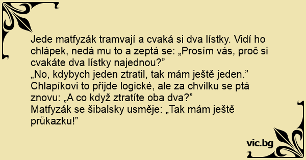 Jede matfyzák tramvají a cvaká si dva lístky. Vidí hо chlápek, nedá mu to a zeptá se: „Prosím vás, proč si cvakáte dva lístky najednou?”